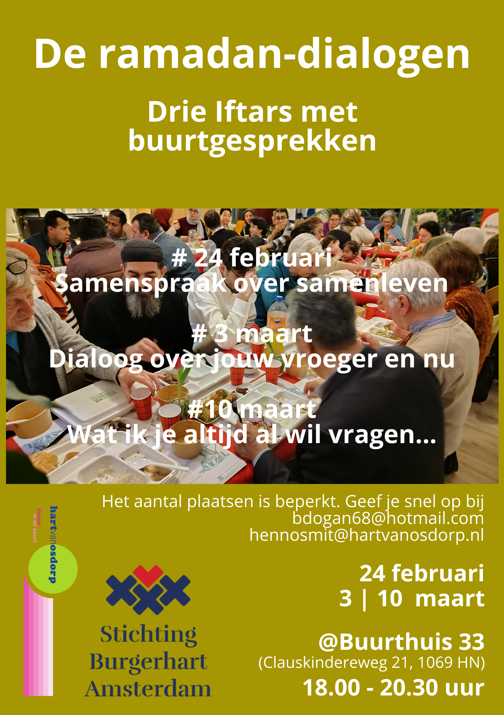 Hart van Osdorp organiseert met Stichting Burgerhart Amsterdam drie Iftars in Buurthuis 33. Na en rondom de Iftar zullen de deelnemers met elkaar in gesprek gaan over verschillende onderwerpen die ons na het hart liggen.